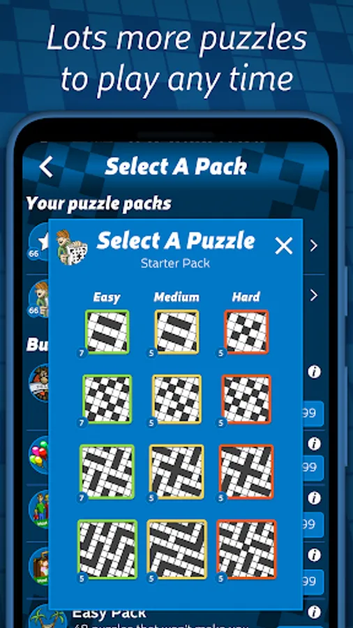 Want to play offline? 60+ quick crossword puzzles are included in 4 grid sizes at 3 difficulty levels, and you can buy extra crossword packs to keep on your device and play anytime!