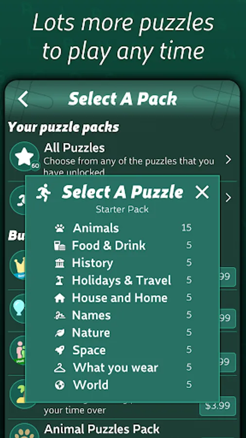 There are 60 built-in and unlocked puzzles with a range of categories, so you can play offline and have fun right away. With over 20 categories, and more than 100 different word lists, there's lots of variety as you play through the free puzzles each day - and perhaps learn something new too.