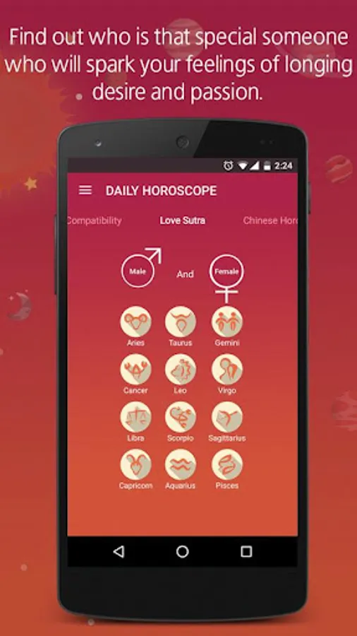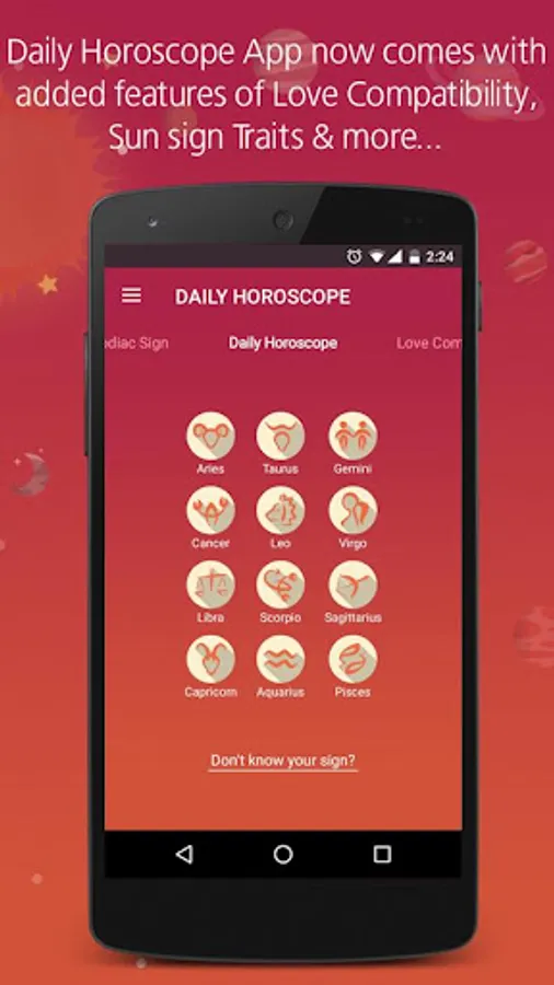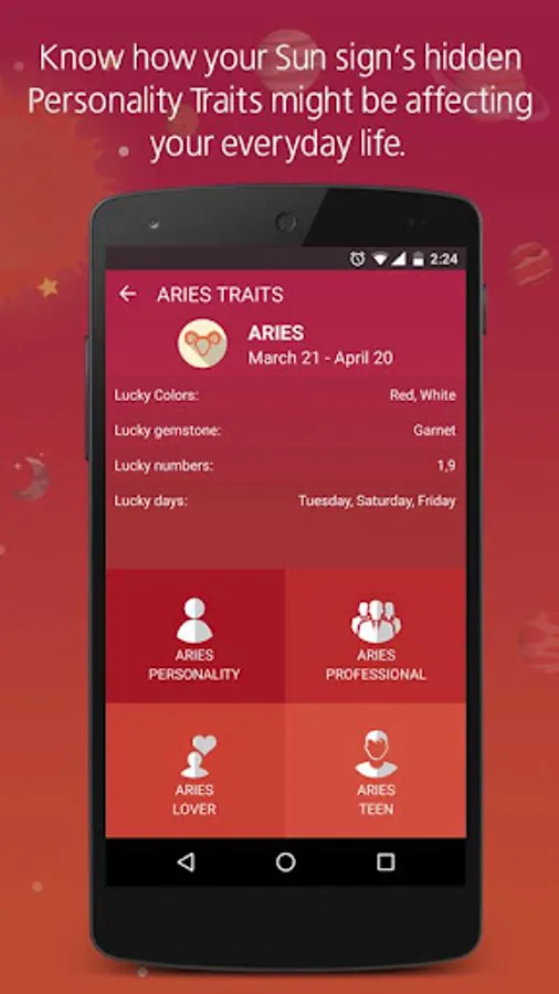 • 4 different types of traits for all zodiac signs (Aries, Taurus, Gemini, Cancer, Leo, Virgo, Libra, Scorpio, Sagittarius, Capricorn, Aquarius, Pisces) along with Lucky numbers, colors and gemstones.