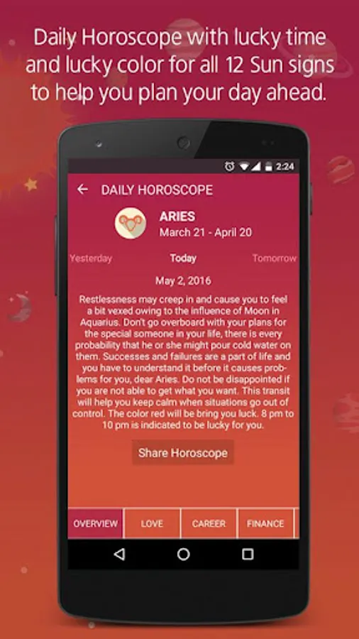 Easy to Use : If you are a fan of reading the daily horoscope, then this free app should come in handy as it is simple and easy to use. Your interest in astrology can range from a passing glance at the daily prediction section in the newspaper or as a guideline for different areas related to marriage, business or even health. This daily horoscope app delivers to your Android devices not only today’s prediction but also predictions for yesterday and tomorrow for each zodiac sign. Daily horoscope prediction provides you with an overview and is divided into love, career, health, and finance as well. You can even check your love compatibility based on your zodiac signs.