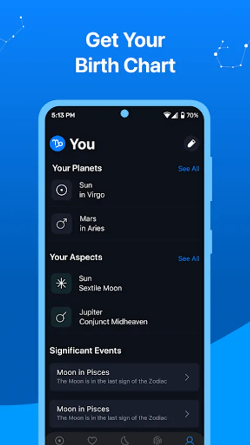 View your birth chart and natal chart based on your birth date, time and place. Get personalized astrology chart and explore your unique birth chart. Get up to date information on planetary transits delivered straight to your device. Your birth chart is updated each day as planets move. Natal chart shows how planets and houses effects your life.