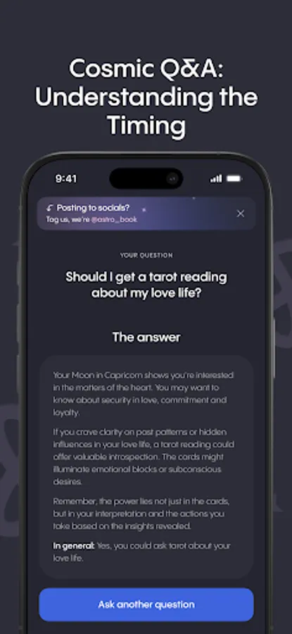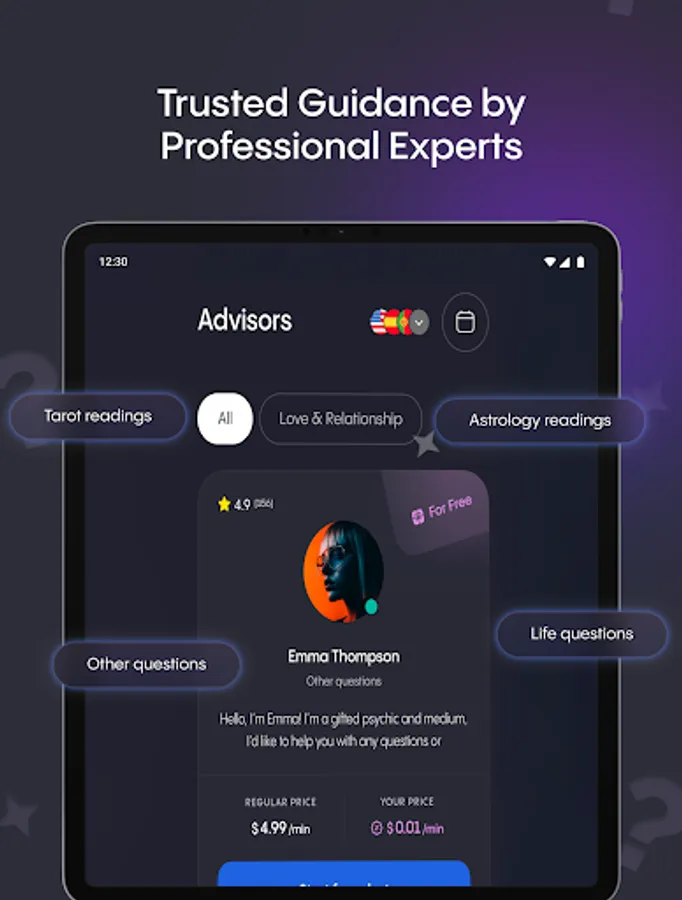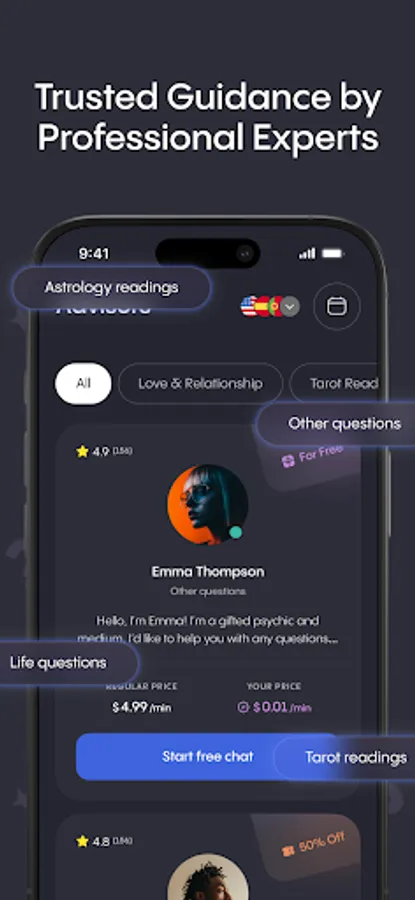 🟪 Advisors on Demand — Ask real humans. Book vetted readers across categories: astrologer consultations, tarot, love & relationships, life questions, and timing strategy. Schedule in-app at your pace.
