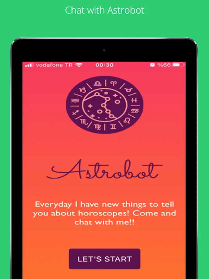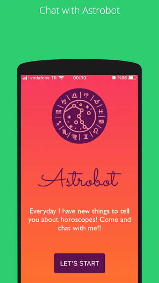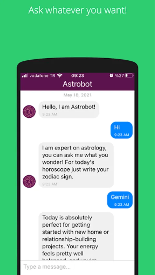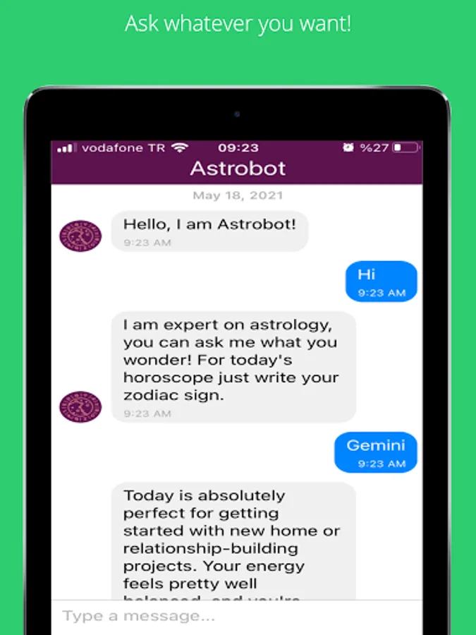Astrobot is a chatbot app about astrology. You can make conversation about your horoscope, daily mood, lucky numbers, luck time in this day, etc according to the stars! Also you can get info about characteristics of zodiac signs and their relations by just asking to Astrobot! No predefined conversations, just write to Astrobot what you want and get the answers!