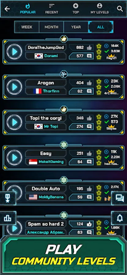 Ranking of top levels, featured creators, and popular levels.