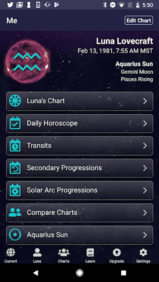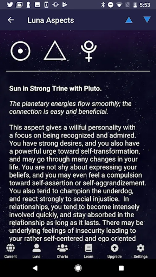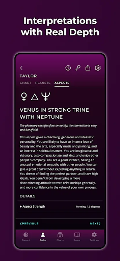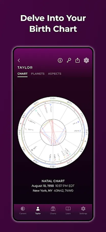 * Explore your Birth Chart with descriptions of each planetary placement and aspect.