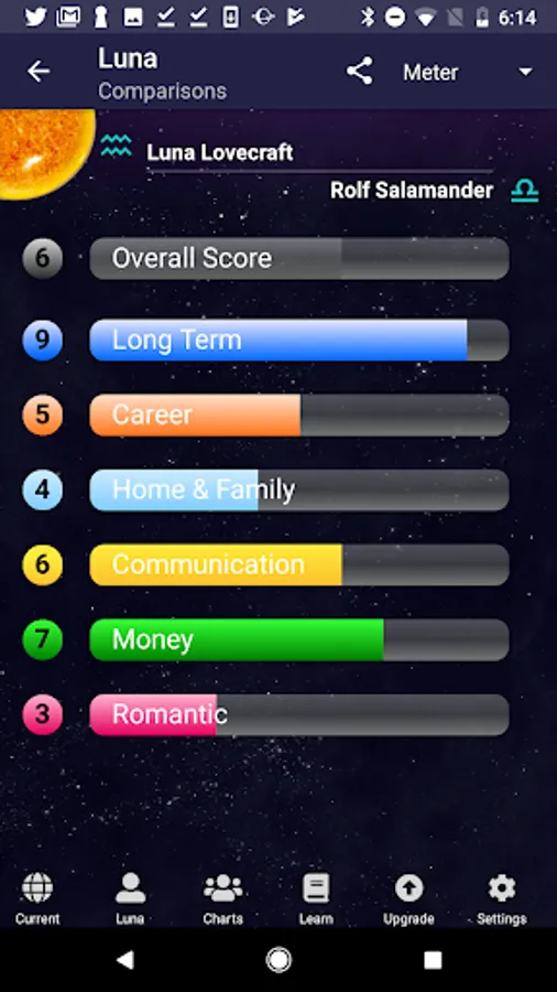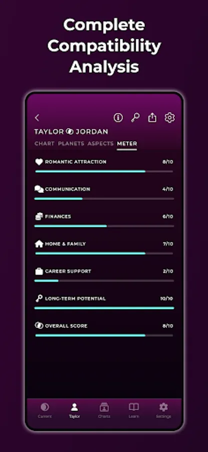 * The Comparison Bi-Wheel Synastry Chart comes with in-depth descriptions of all relational aspects, and an at-a-glance Compatibility Meter showing potential for romance, money, communication, and more.