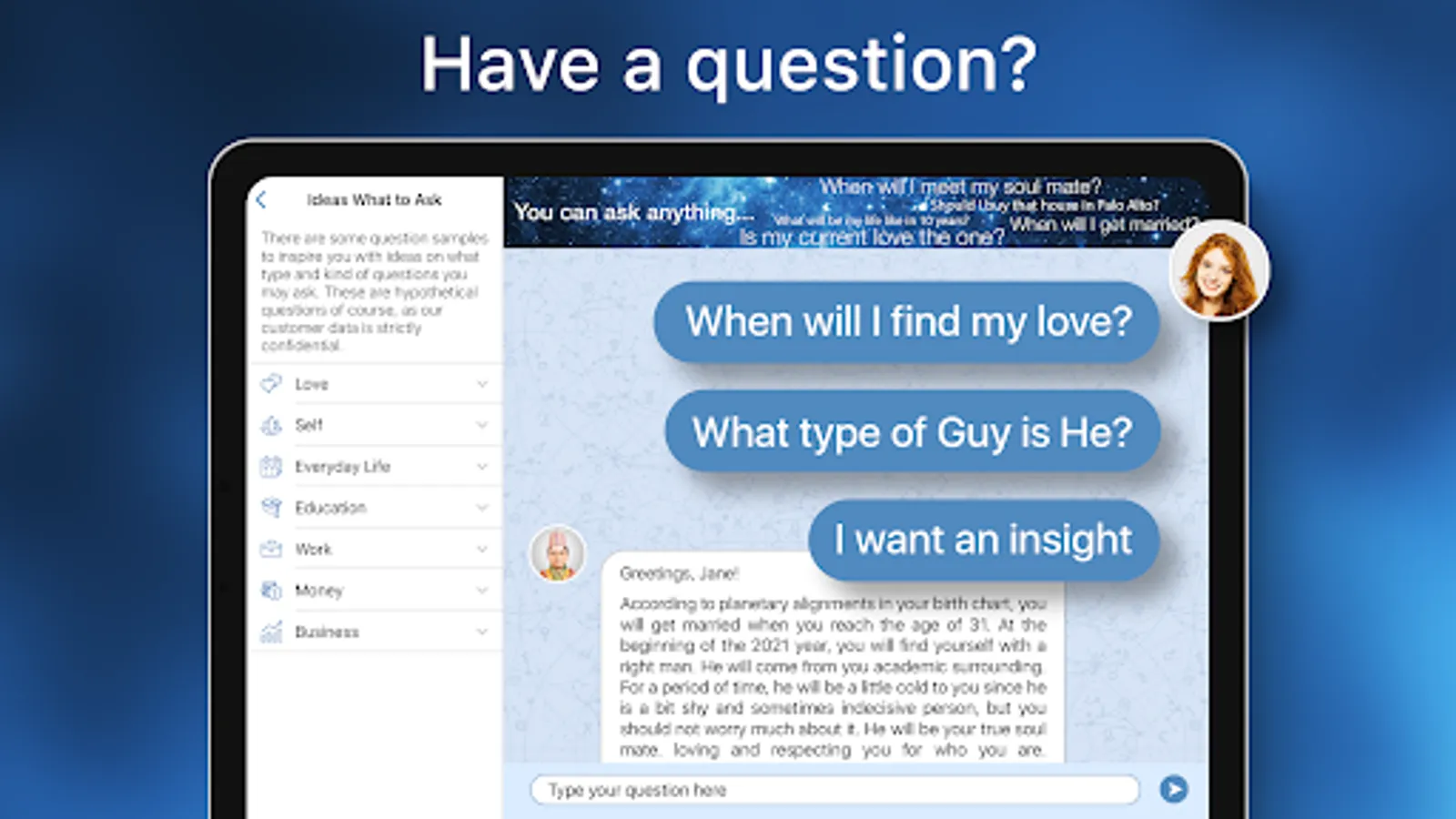 • Insightful answers. Accurate predictions are just a click away. The present, the future will be seen through a birth chart based on your unique date and place of birth.