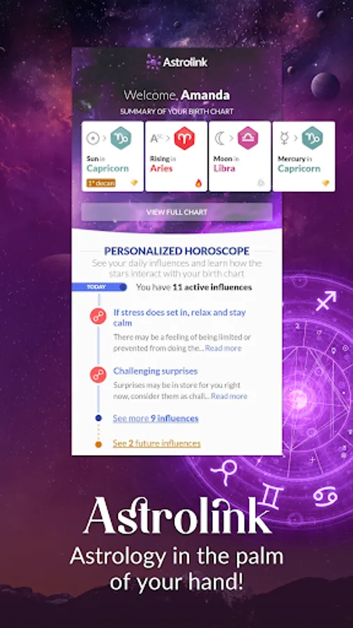Download Astrolink, enter with your birth information and receive a free, complete and personalized horoscope and birth chart astrology with your astrological journey, zodiac signs, energy distribution, basic characteristics, positions of the stars, astrological houses, horoscope, tarot card reading, synastry and much more. It is not just a birth chart horoscope, it is a personalized birth chart horoscope made only for you.