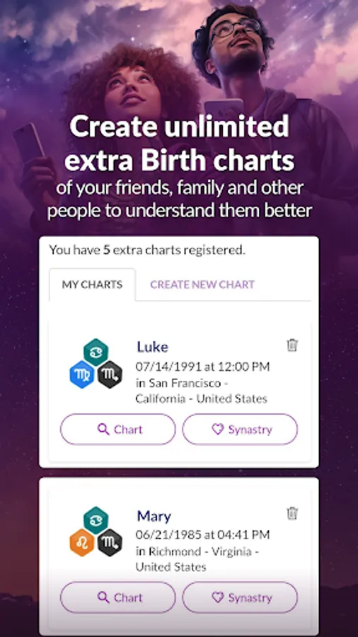 With your birth information, we create a personalized birth chart. Find out which zodiac signs have the most influence on your personality and understand how astrology interacts in your relationship with family, friends, work, etc. In Astrolink, it is also possible to create and save the birth charts of the people you know, understanding the high and low points of the relationship. Save to consult them at any time!