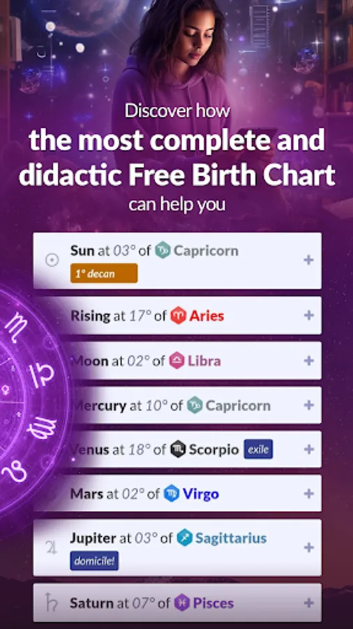 Download for free and have access to a free personalized horoscope and birth chart with your astrological journey, zodiac signs, energy distribution, basic characteristics, positions of the stars, astrological houses, horoscope, tarot card reading, synastry and much more.