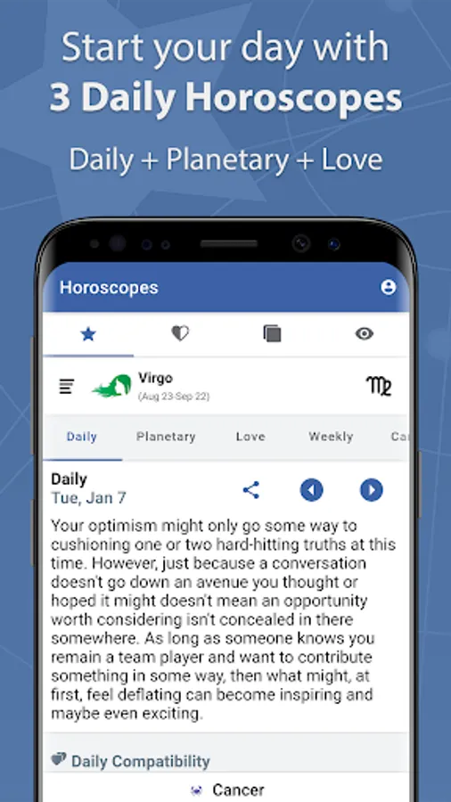 Go beyond your Daily Horoscope. This app features a wide variety of Daily, Weekly, Monthly and Annual Horoscopes, along with Zodiac Sign Compatibility and Tarot Card Readings.