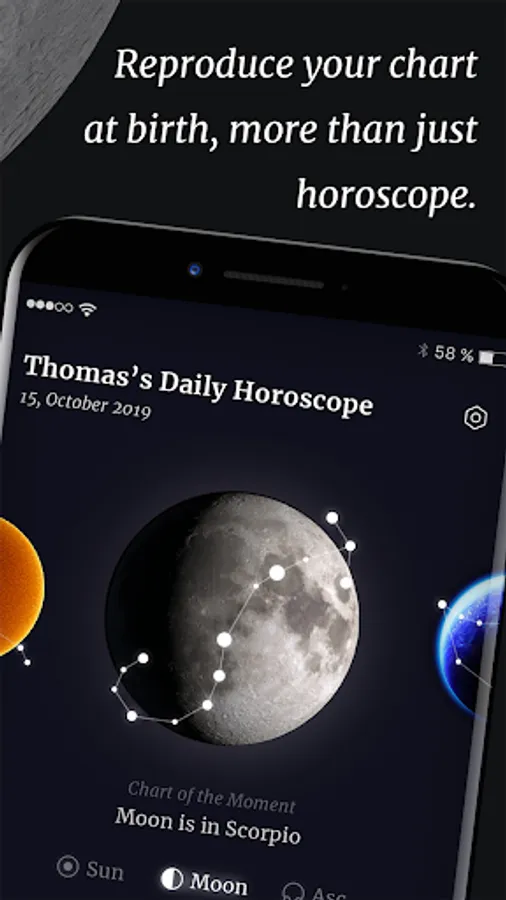 Restore your birth chart: Your relationship with sun, moon and planet, please enter your information, it is not only shows constellation, it shows the scene graph of sky in your birth time.