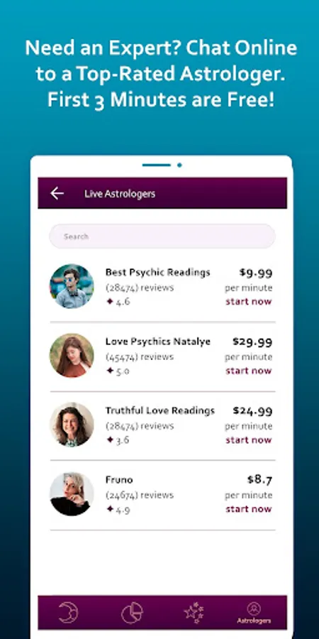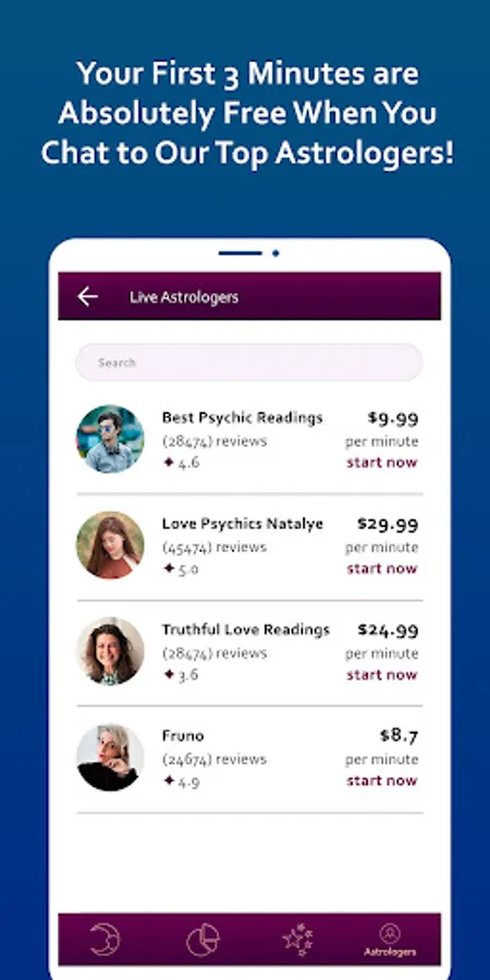 Review all astrologers, choose your favorite Psychic and start a conversation with him/her. Get a FREE Psychic reading for the first 3 minutes!