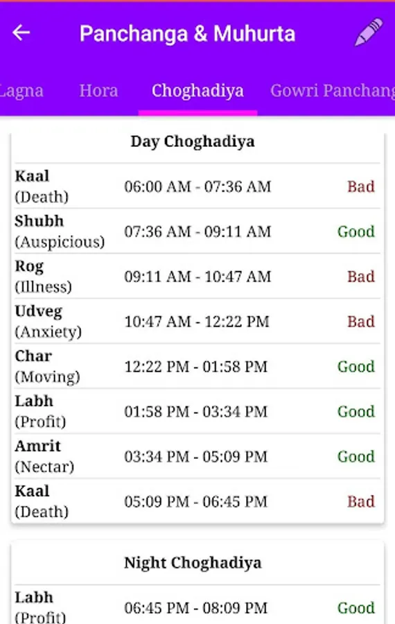 * Panchanga: Daily Panchang & also Muhurat, Hora (Day and Night), Choghadiya system,