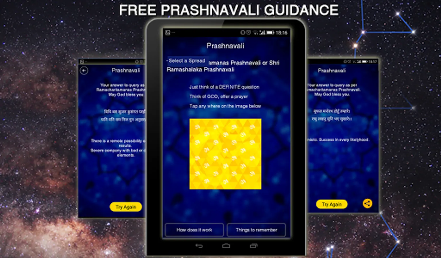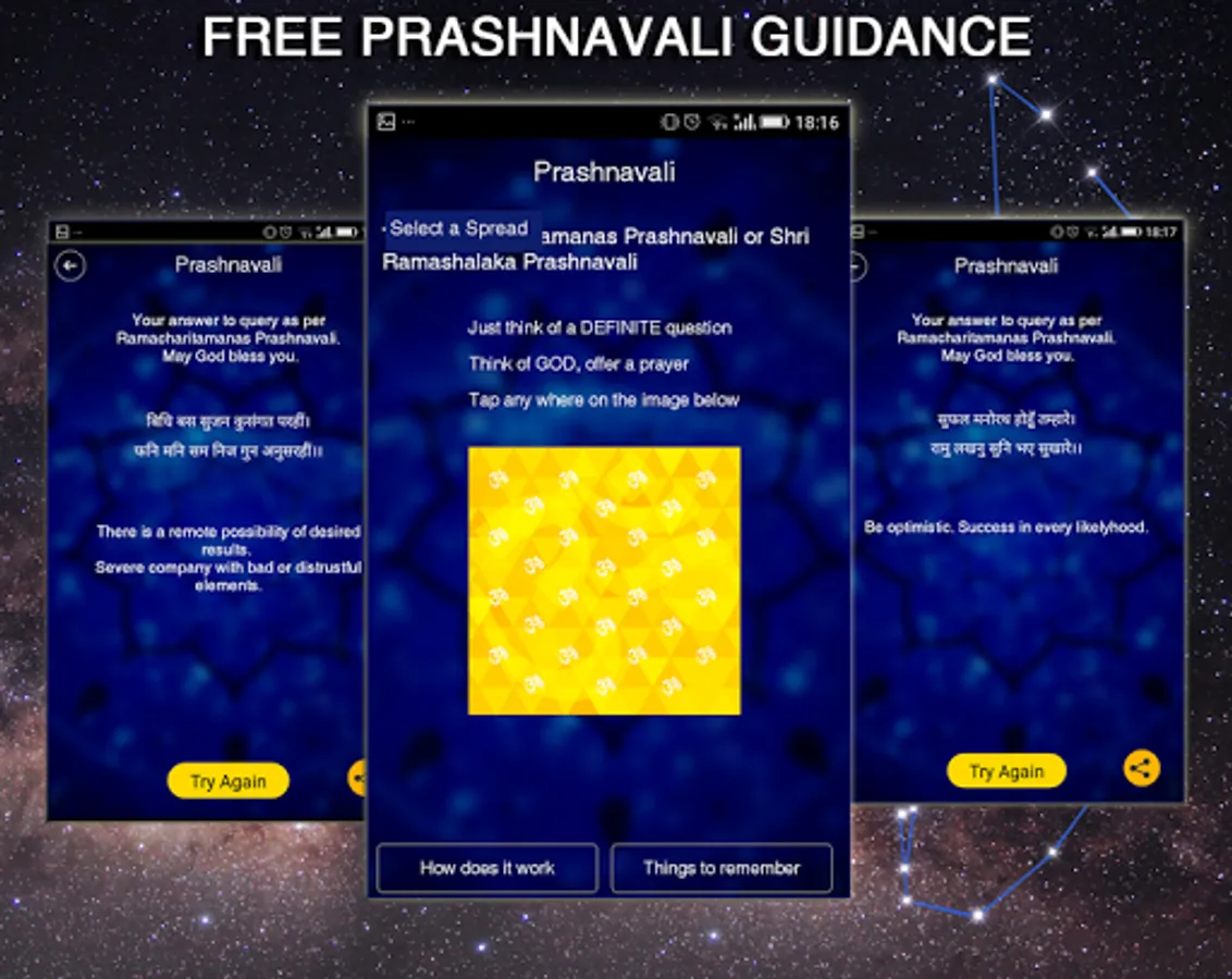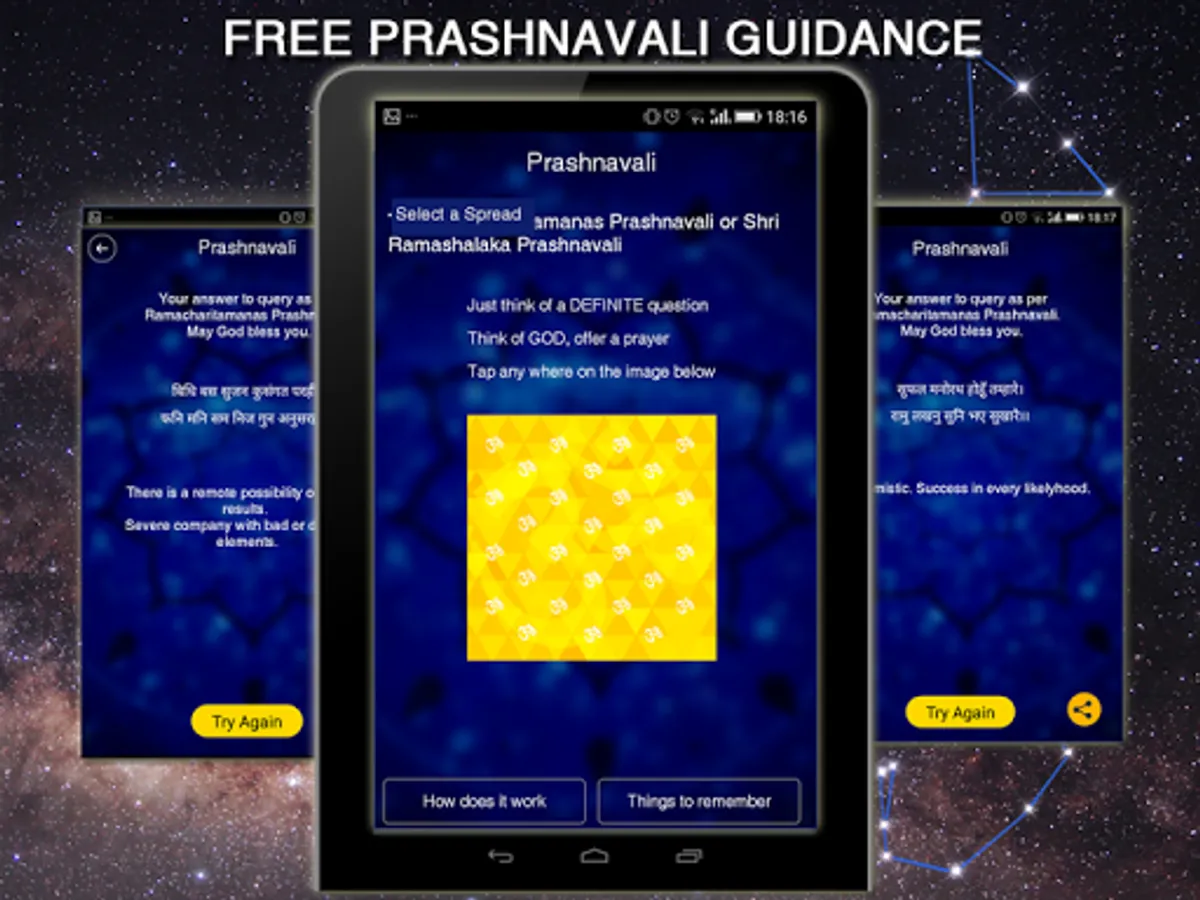 The answers in the Prashnavali app are based on the Choupais (couplets) of 'Shri Ram Charit Manas' or Ramayana written by poet-saint Tulsidas. Ramayana Prashnavali is used to get answers to your questions, predict the outcome of new endeavors, overcome double-mindedness, resolve doubts and select the right path since Vedic times.