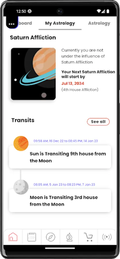 AstroVed app offers a wide range of Vedic Astrology tools FREE! You can now know your lucky color/number/gemstone for your Moon sign, the presence of any Dosha (affliction) in your birth chart and the most dreaded Sade Sati in a single click.