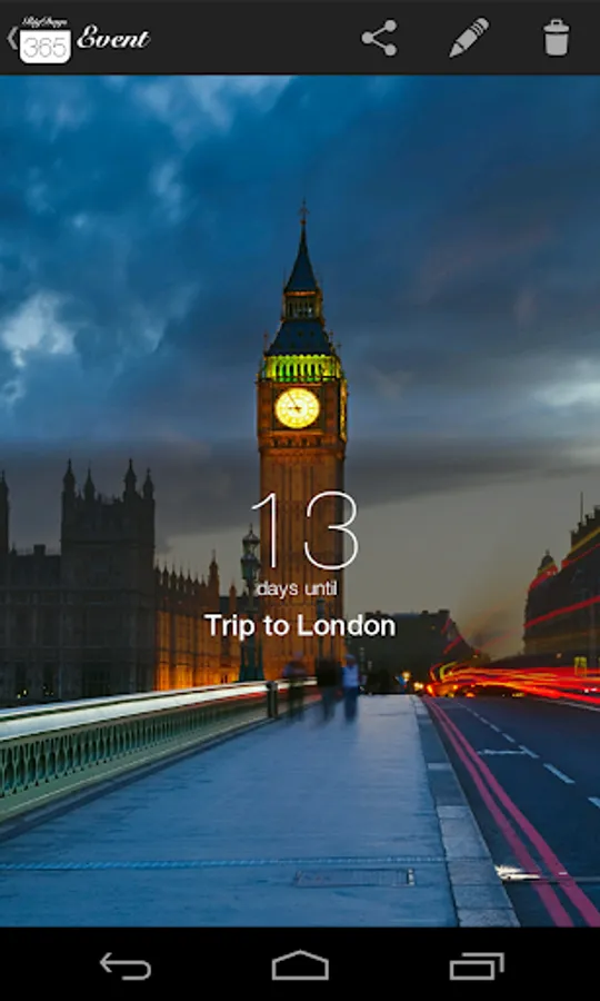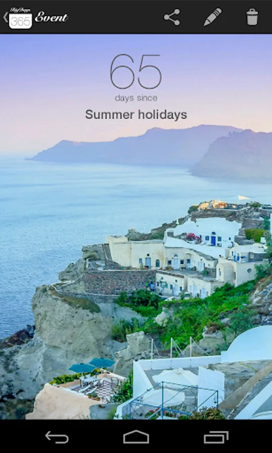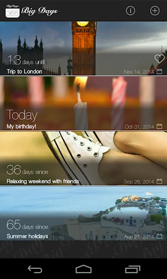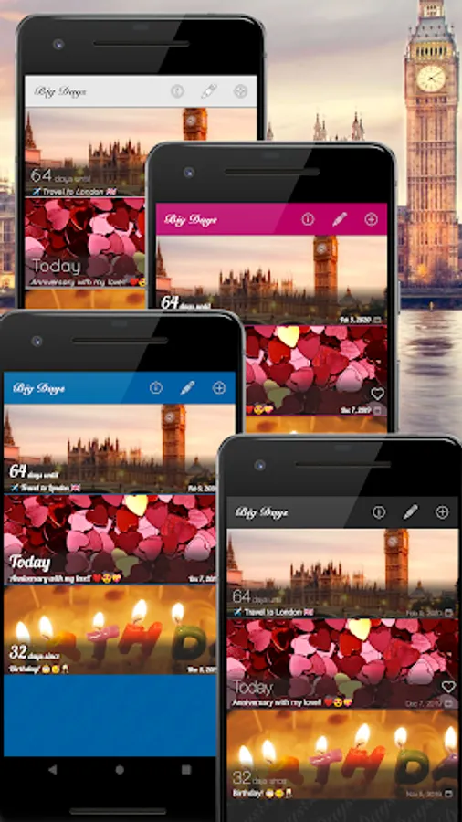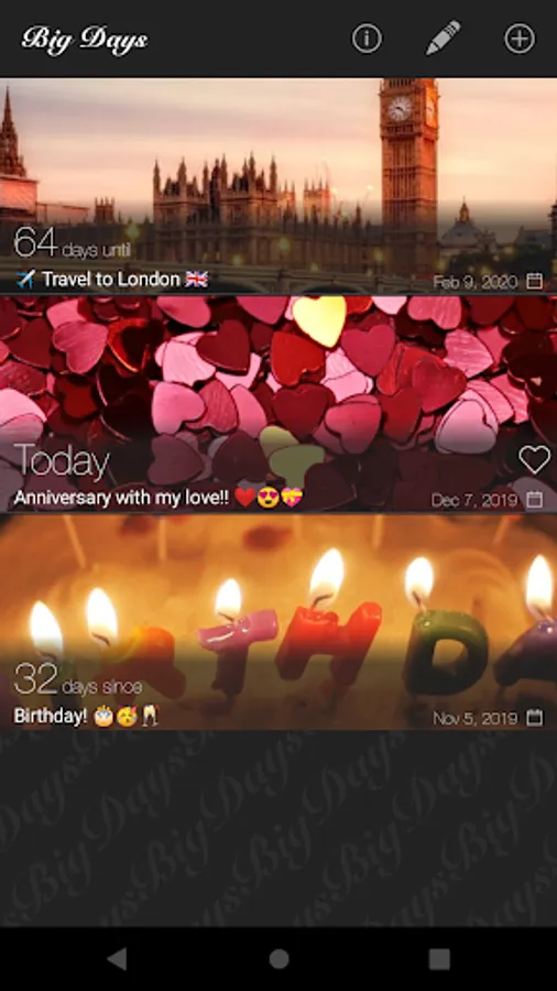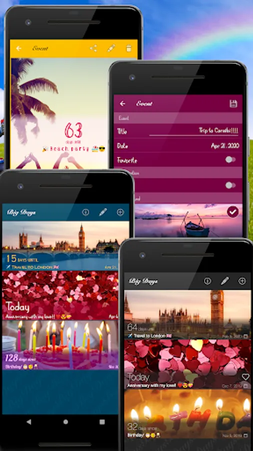 View the remaining days or days elapsed after an event. You can use it to remind you: appointments, anniversaries, birthdays, holidays, exams, events festivals ... customize with your own photos or use the search feature that finds thousands of free images on Pixabay!