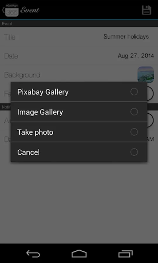 - Choose the event image, from: camera, gallery or search online on Pixabay;