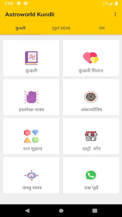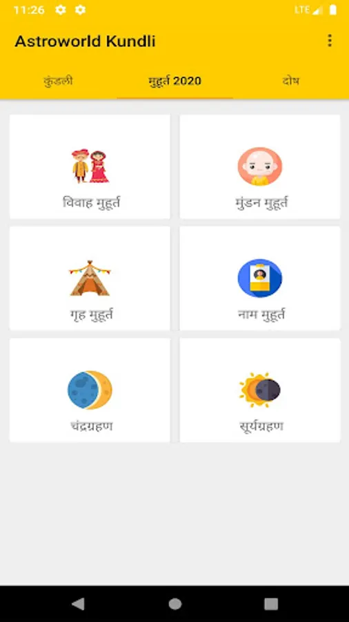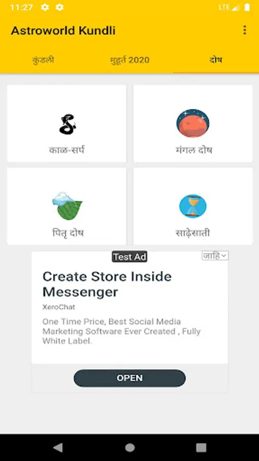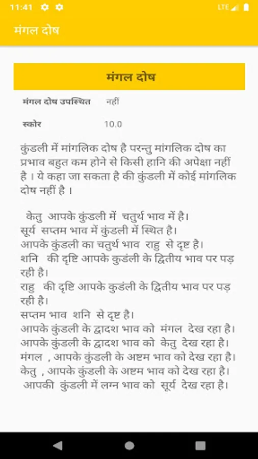 The app also includes a Dosh feature, which provides information on four doshas: Kal-sarp dosh, Mangal dosh, Pitra dosh, and papasamayam. Users can determine whether any of these doshas are present in their birth Kundali and gain brief insights into each dosha's implications.