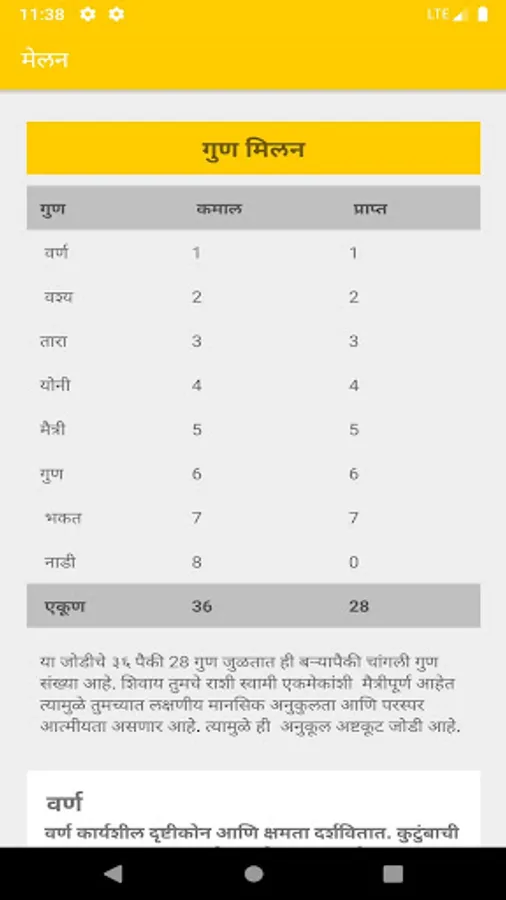 The app also includes a compatibility matching feature, which allows users to compare their birth charts with those of their potential partners. By analyzing the compatibility between two individuals based on their Kundalis, the app provides a compatibility score or matching points (Guns). It further provides a detailed gun milan table, highlighting the strengths and weaknesses of the match based on various astrological factors.