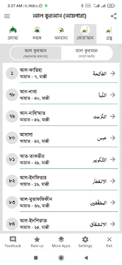 - পবিত্র কুরআনে পাকের আমপারা অর্থাৎ ৩০ তম পারার বাংলা, ইংরেজি, হিন্দি ও উর্দূ সহ অনুবাদ