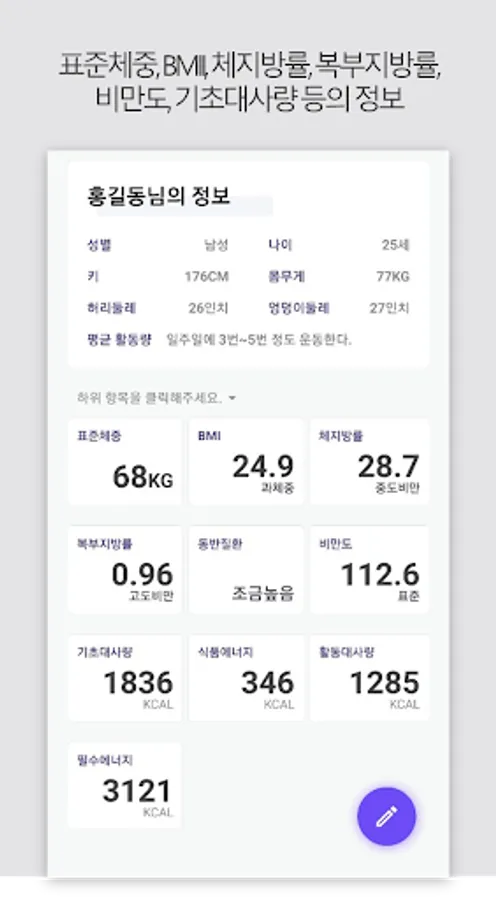 3. 체지방률, BMI, 평균체중, 복부지방, 동반질환, 비만도, 기초대사량, 식품에너지, 활동대사량, 필수에너지의 수치를 확인할 수 있습니다.