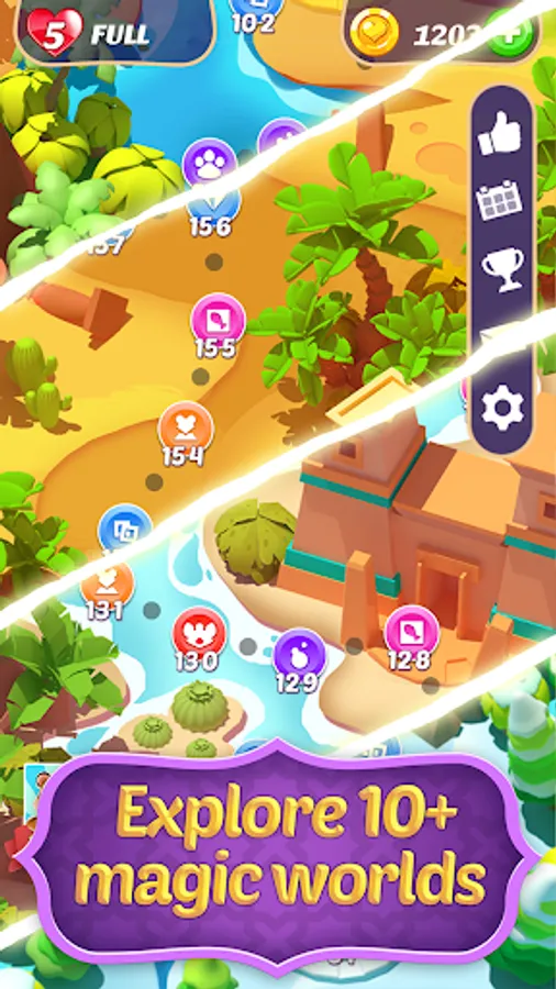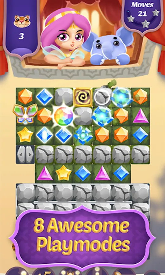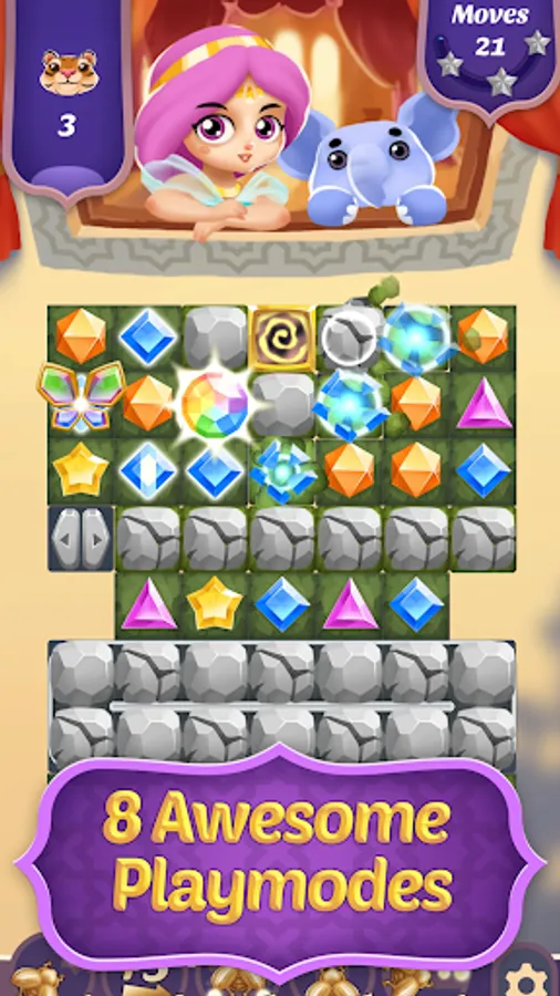 Link gems with same color to collect treasures for the princess. While a link between 6 or gems is made, butterflies will put special gems in a random cell.