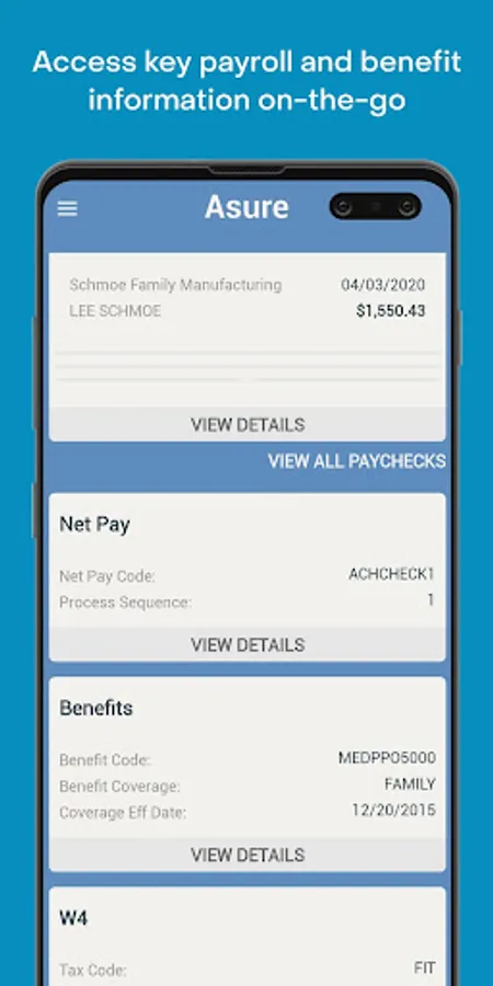 With the Asure Mobile app for the Asure mid-market HCM solution, employees can easily review key payroll and benefit information at any time, from anywhere. The app is free for employees to use and is included with the purchase of the mid-market HCM software.