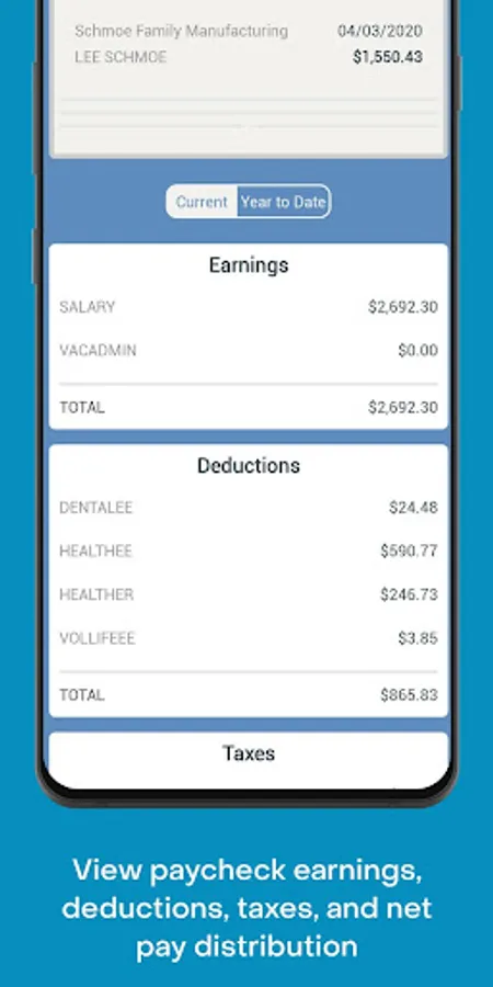 · View current paycheck, including earnings, deductions, taxes, and net pay distribution