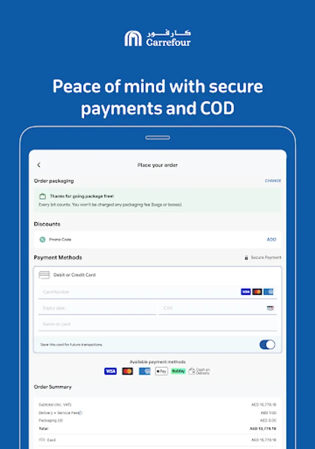 Order your groceries online now and pay zero cash by using your Carrefour wallet to make payments. You can easily top up Carrefour Pay using your credit or debit card.