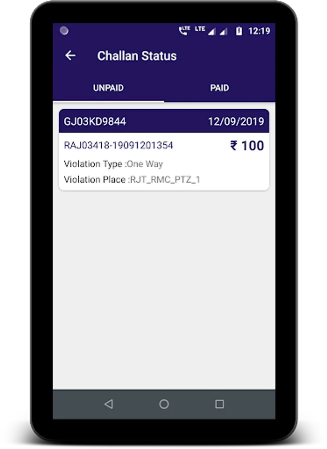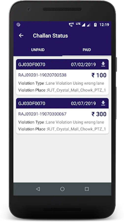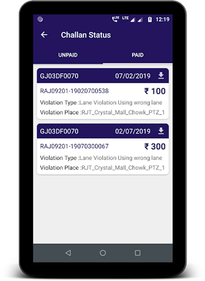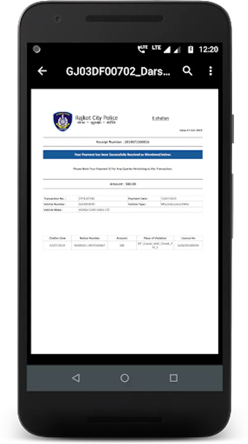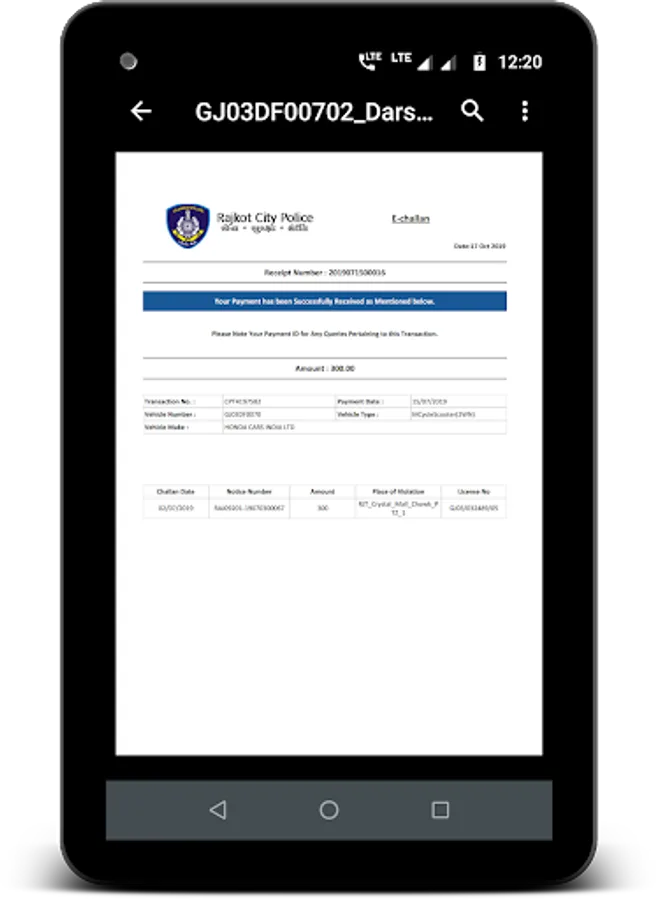 » You can download challan status receipt for the paid challan. Challan receipt contains information like receipt number, transaction number, payment date, vehicle number, vehicle type, vehicle make, notice number, amount, and place of the violation.