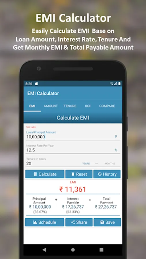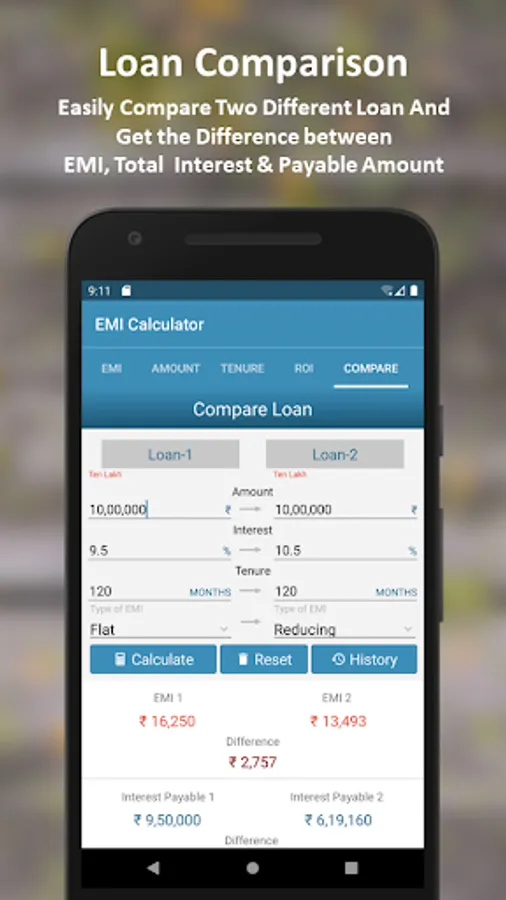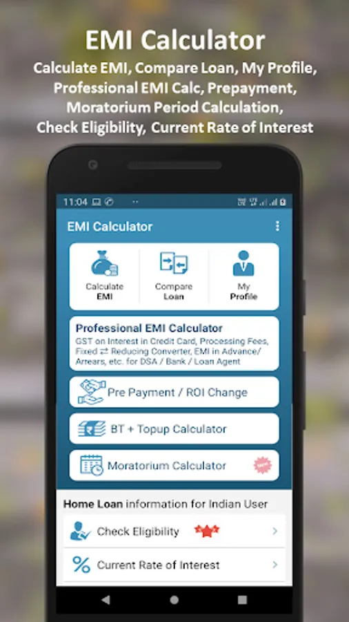 EMI Calculator App is a handy tool to calculate EMI for Home Loan, Car Loan, Bike Loan, Gold Loan, etc. This App has unique features like USD & INR currency mode, History to reuse past calculations, Profile to save complete loan information, Home / Personal Loan Eligibility Calculator & Documents List, etc. It is capable of reverse calculations like Principal Amount, Rate of Interest, Loan Tenure. This app is free to download Home Loan / EMI Calculator / Mortgage Calculator / personal loan calculator, with easy to use UI and works in offline mode.