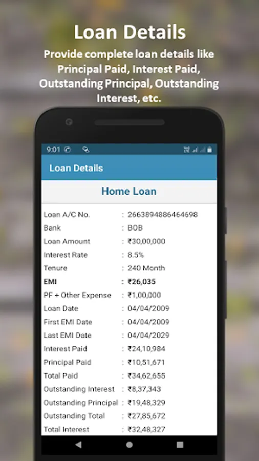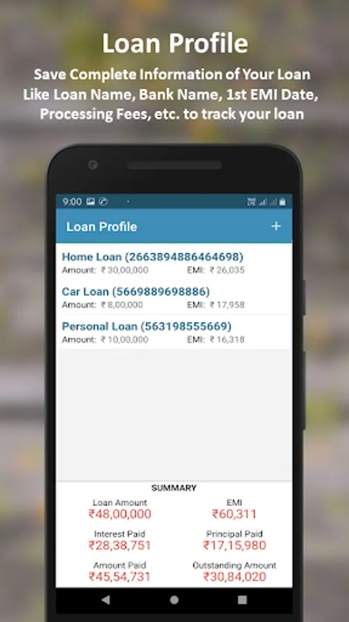 » Loan Profile: You can save complete information of your loan like Loan Name, Bank Name, Loan Account Number, Loan Date, 1st EMI Date, Processing Fees, etc. to track your loan. Here you will get information like total loan amount, total EMI to pay.