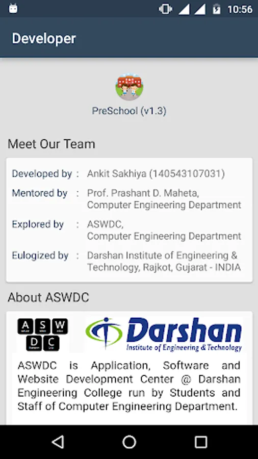 This App is developed at ASWDC by Ankit Sakhiya (140543107031), a 7th Sem CE Student. ASWDC is Apps, Software, and Website Development Center @ Darshan University, Rajkot run by students & staff of Computer Science and Engineering Department.