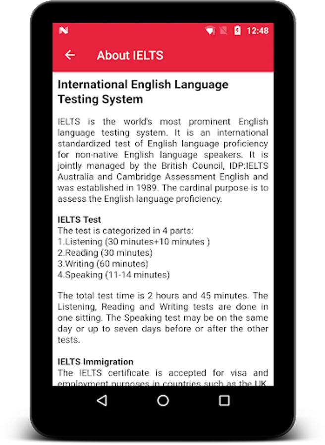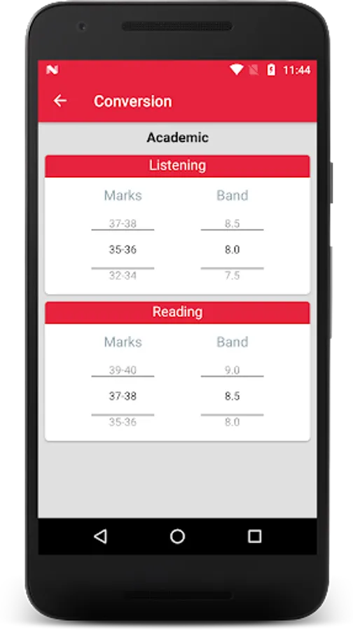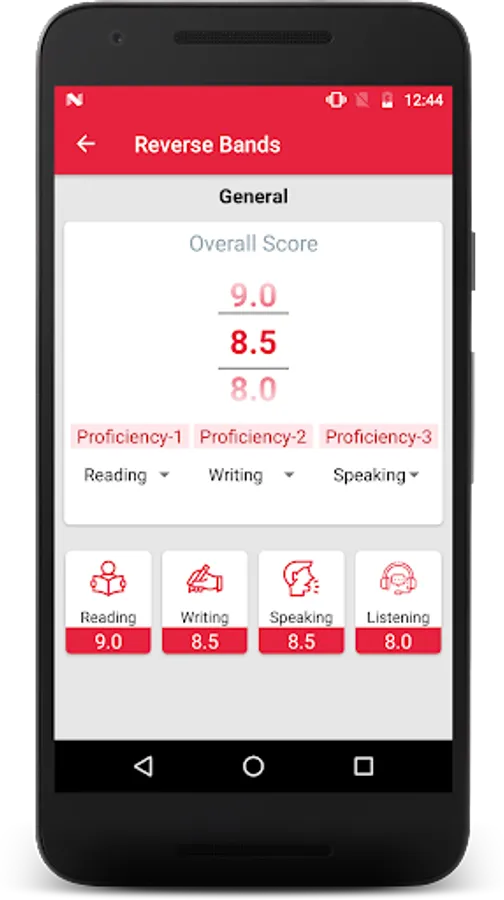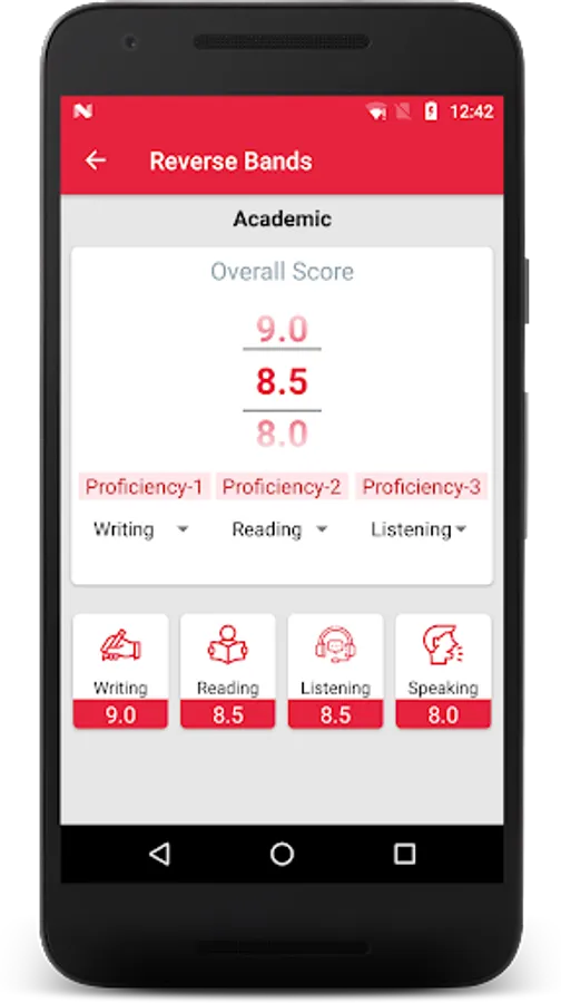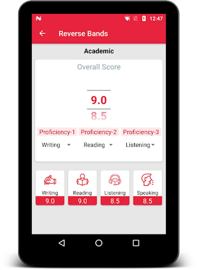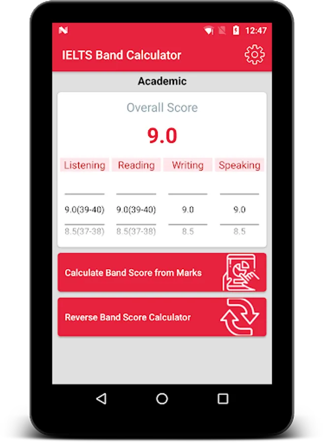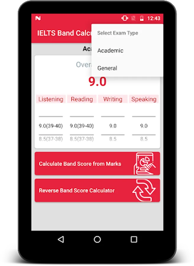 IELTS Band Score Calculator app helps you calculate your band score based on the IELTS test results. Select Exam Type from the available options as Academic Training or General Training. Overall Score is based on marks scored in listening, reading, writing, and speaking test.