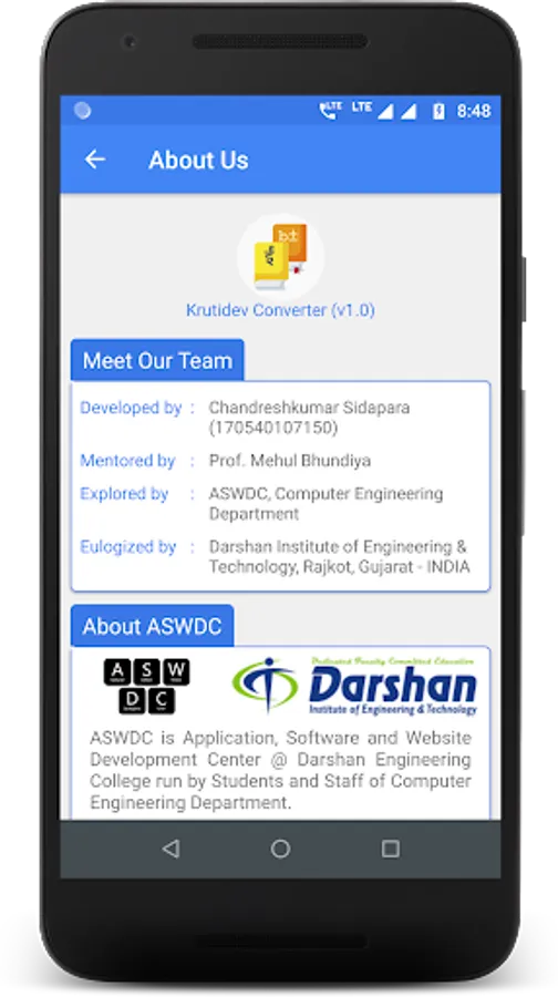 This App is developed at ASWDC by Chandreshkumar Sidapara (170540107150), the 7th Sem CE Student. ASWDC is Apps, Software, and Website Development Center @ Darshan University, Rajkot run by students & staff of Computer Science and Engineering Department.