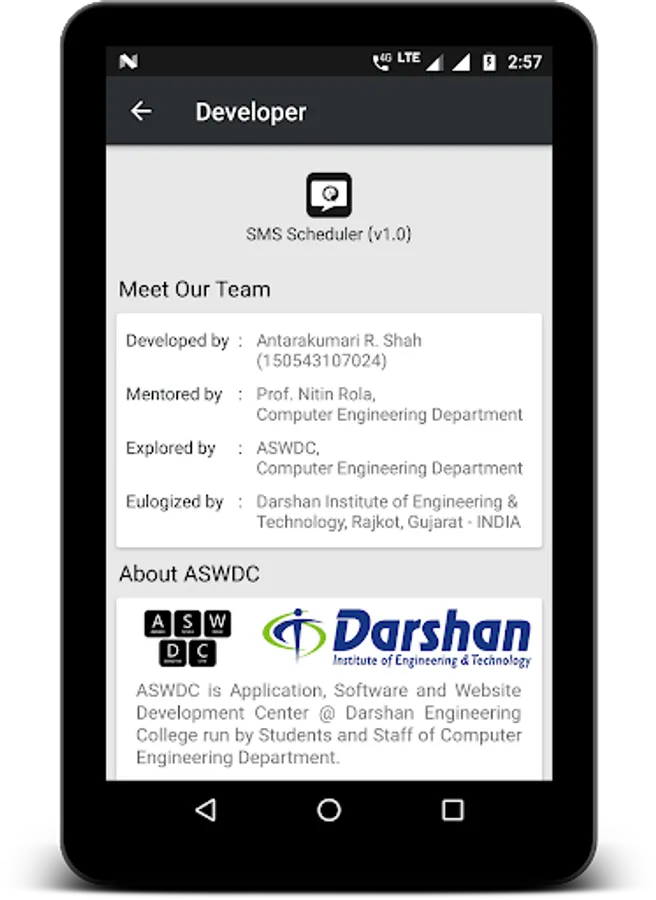 This App is developed at ASWDC by Antarakumari Shah (150543107024), the 8th Sem CE Student. ASWDC is Apps, Software, and Website Development Center @ Darshan Institute of Engineering & Technology, Rajkot run by Students & Staff of Computer Engineering Department