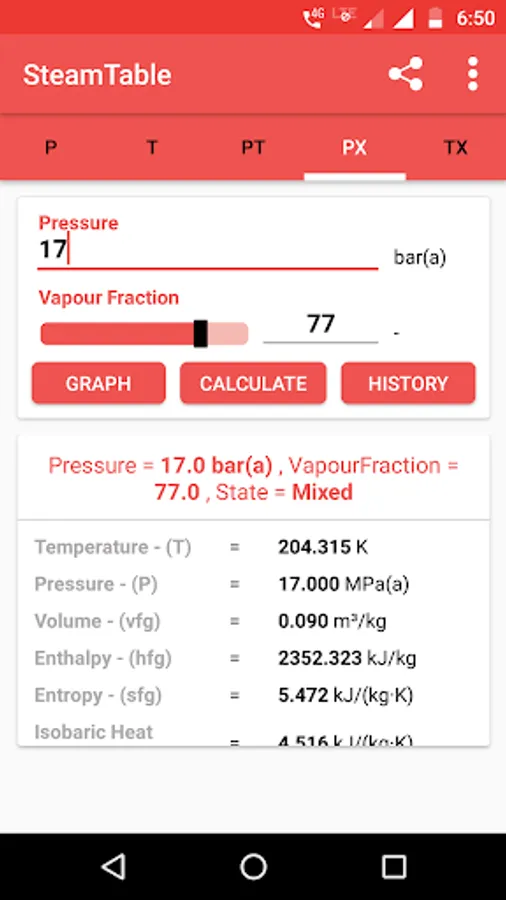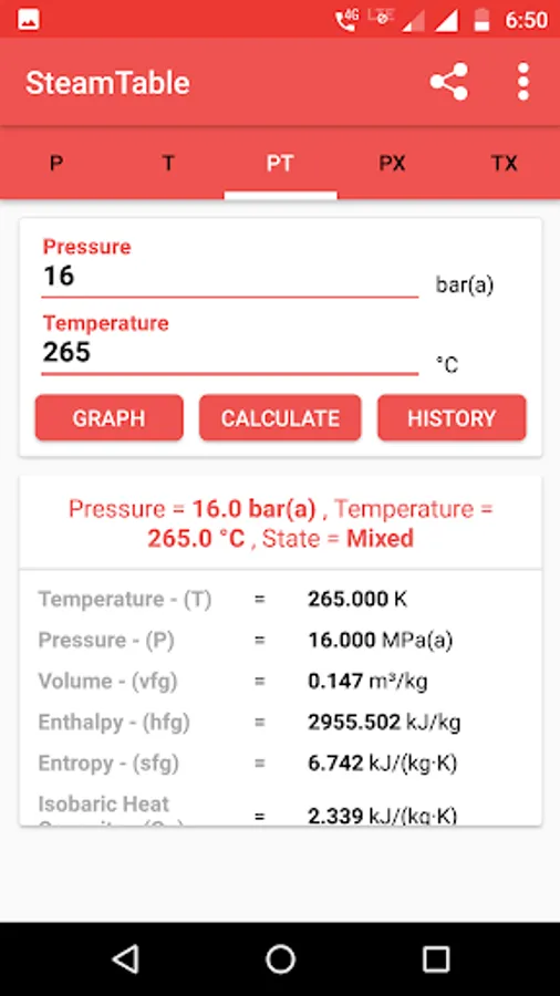 A steam table is an app that helps you calculate water's thermodynamics property using the collection of experimental data on temperature, pressure, volume, and the energy contained in water and steam. It is based on a scale of either absolute or relative pressure. Steam Table app helps you find the steam temperature, steam pressure based on the value entered. It also gives the volume of water and steam at various temperatures and pressures, which is useful for calculations in thermodynamics. This app works as your portable steam table to calculate enthalpy and entropy.