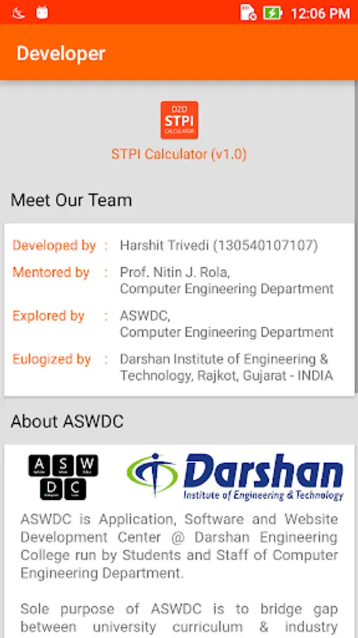 This App is developed at ASWDC by Harshit Trivedi (130540107107), a 7th Sem CE Student. ASWDC is Apps, Software, and Website Development Center @ Darshan University, Rajkot run by students & staff of Computer Science and Engineering Department.