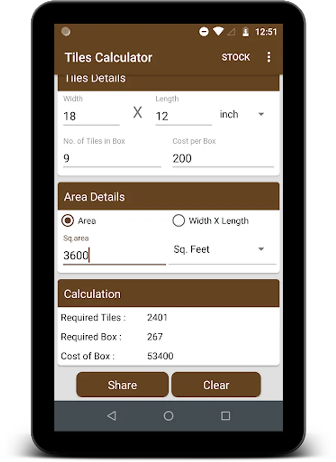 Tiles Calculator is an app that solves two purposes of managing stock and calculating/estimating floor, wall, and roof tiles required in construction.