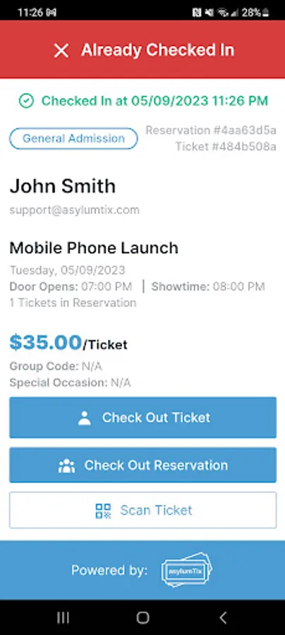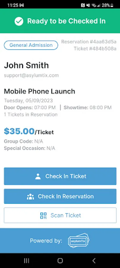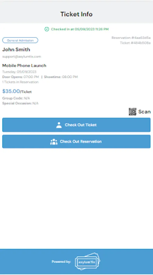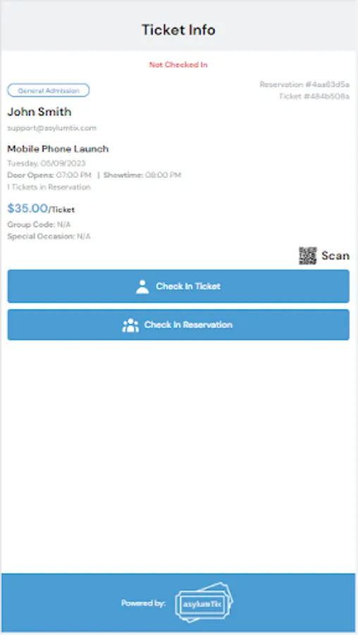 asylumTix is a ticketing company for all types of venues and events. Our platform allows users to set up their company, create one or more venues and then create events for those venues. We are focused on the venues and events and create an environment where the venue and event are the focus and we are just a footnote. Patrons want to interact with the venue and event and we want to make sure their experience makes them feel like they never left the venue's website. Please contact us at support@asylumtix.com for additional information. This application is used by the venue during the event to check in users. We optimized the process by allowing a reservation, which could be more than one ticket, to be checked in with one click.