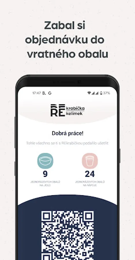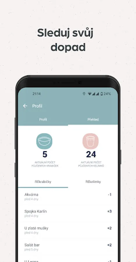 Borrow and return our packaging and the app will take care of everything for you. You will get an overview of how much waste you have already managed to save, where the nearest partner businesses are in your area, or how many REboxes and REcups you currently have on loan. You don't have to deal with the payment of advances, everything is processed automatically and without cash. Collect points and later exchange them for interesting rewards.