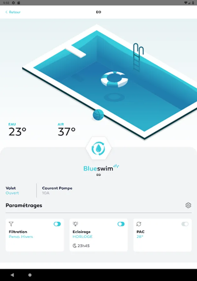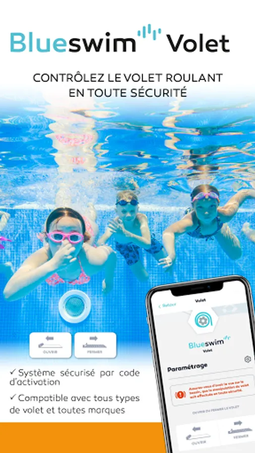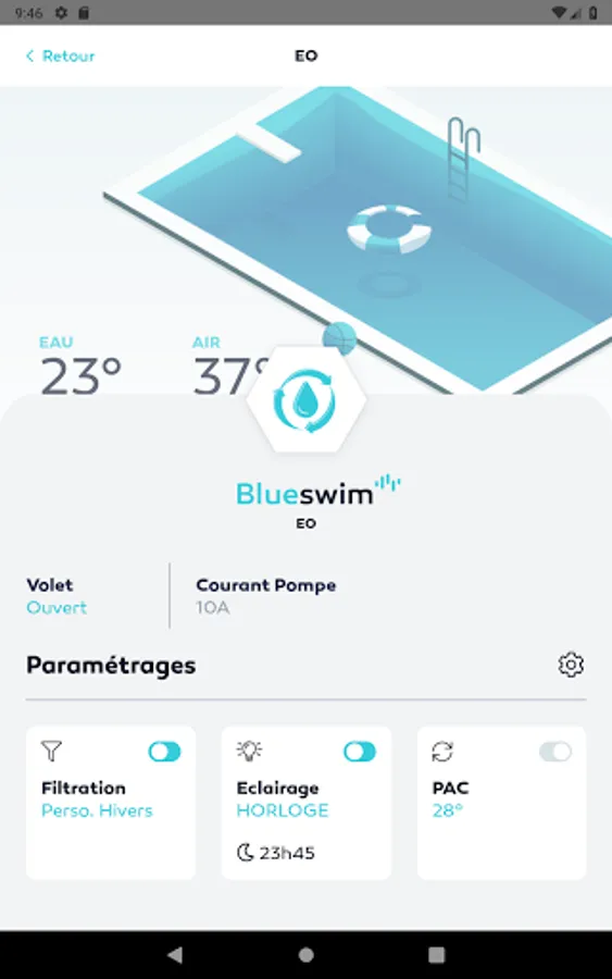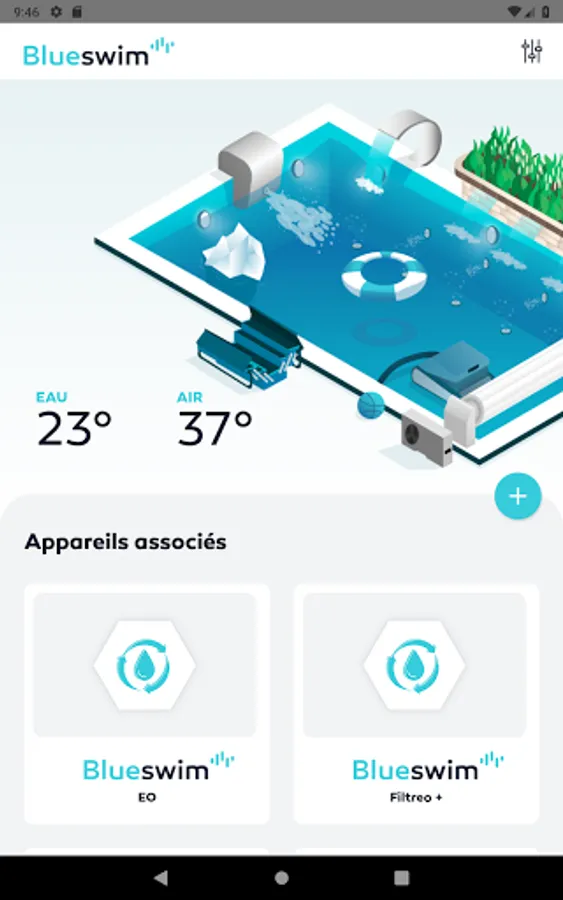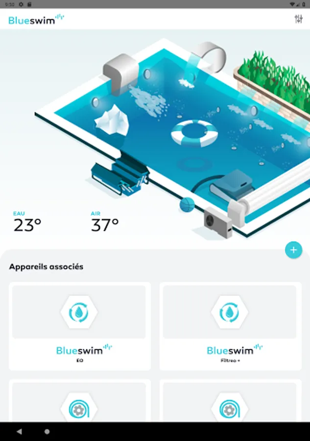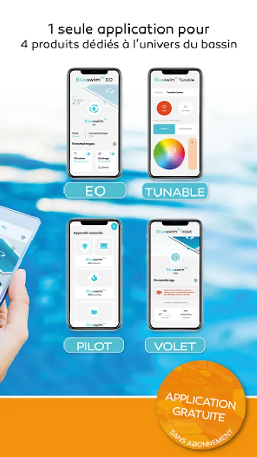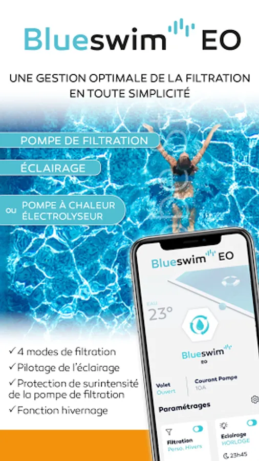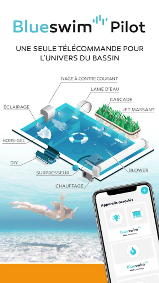 Welcome to the Blueswim universe: the application allowing you to control in Bluetooth® from your smartphone all the equipment of the pool: shutter, lighting, filtration pump, heat pump, electrolyser, water blade, booster, and many more other...