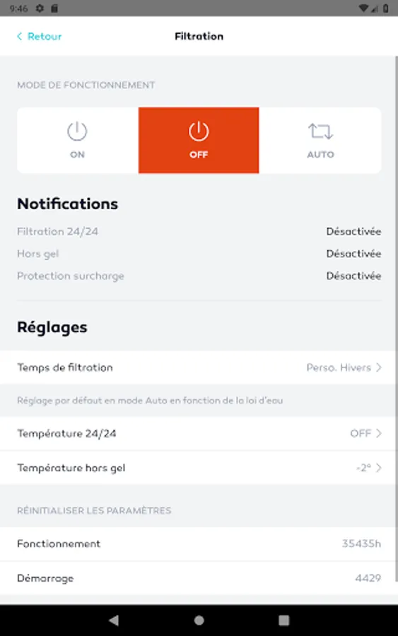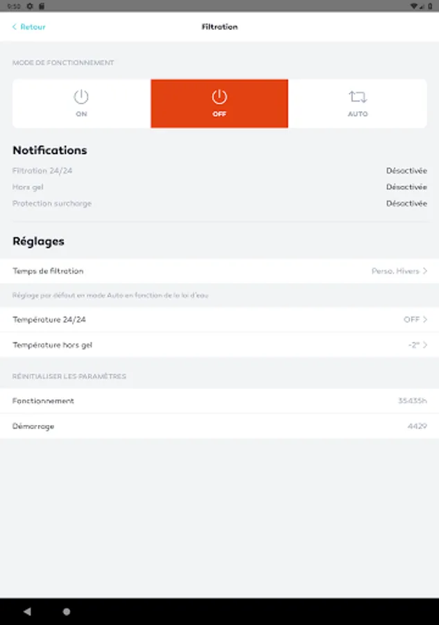 - Filtration mode: ON / OFF, auto, water law, customizable clock