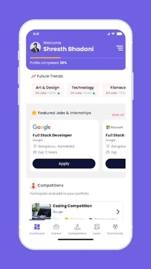 Edulyst is an innovative ecosystem for upskilling and employability where users can explore jobs, build portfolios, and get hired globally. Users can participate in the community and view the content shared by different alumni and industry professionals. Users can also participate in the competitions as well to earn points. Users can also view the domains and job roles, respective salary range in the market. Users can also build the detailed portfolios to showcase the experience and the work they have done.