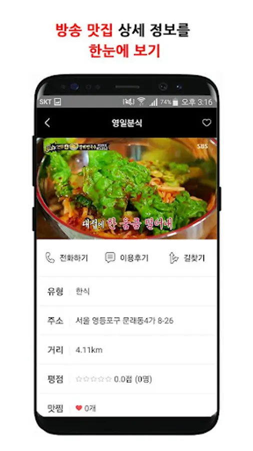 -Holds information on more than 1,000 restaurants such as Baek Jong-won's three great kings, demand food society, delicious guys, and Sikshin Road