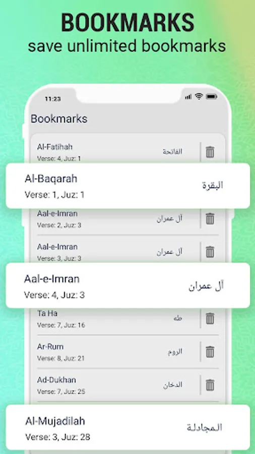 Access all 30 Juz and 114 Surahs, complete and unabridged.