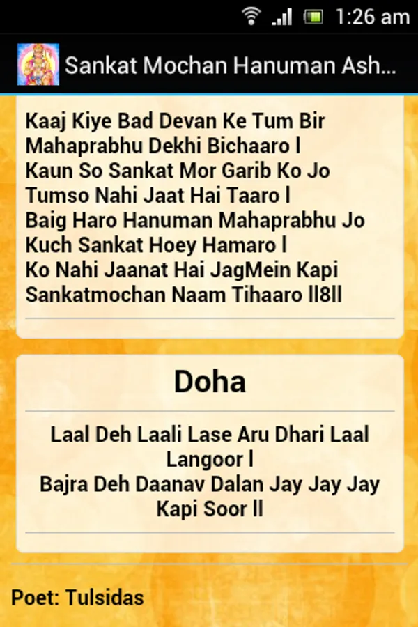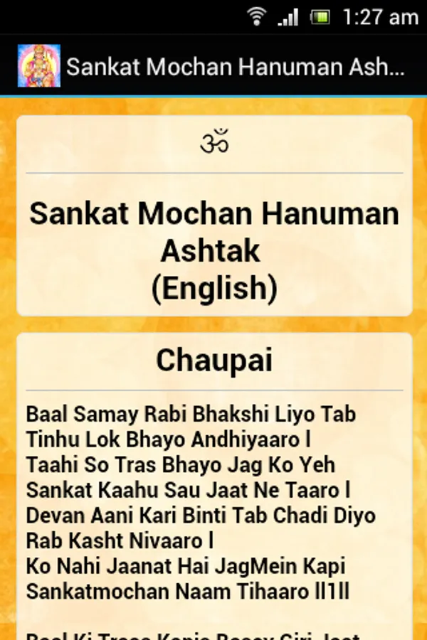 The Sankat Mochan Hanuman Aashtak is an eight verse prayer in praise of the Lord Hanuman, the God of courage, strength, confidence and devotion. This Prayer is recited by devotees of Hanuman in order to overcome obstacles, dangers, and trouble from enemies.
