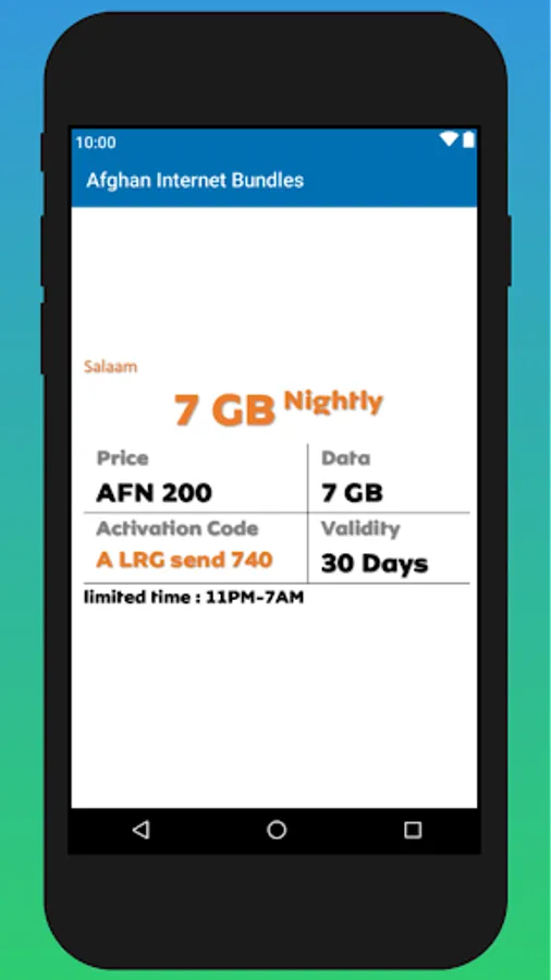 Afghan Wireless, Etisalat, Roshan, MTN, Salam provide different internet offer for a different time for their customer. Any Afghan Wireless, Etisalat, Roshan, MTN, Salam internet packages may change or expired or canceled by Afghan Wireless, Etisalat, Roshan, MTN, Salam at any time. We are not liable for any data change or expired by Afghan Wireless, Etisalat, Roshan, MTN, Salam operator. We always try to publish updated information on this app.