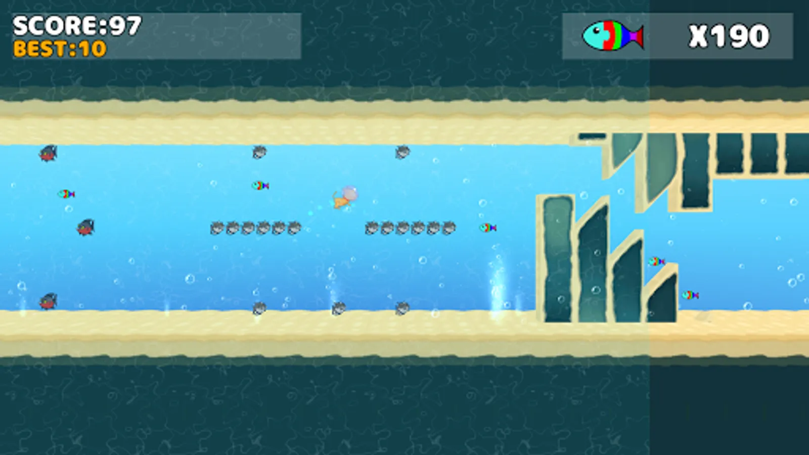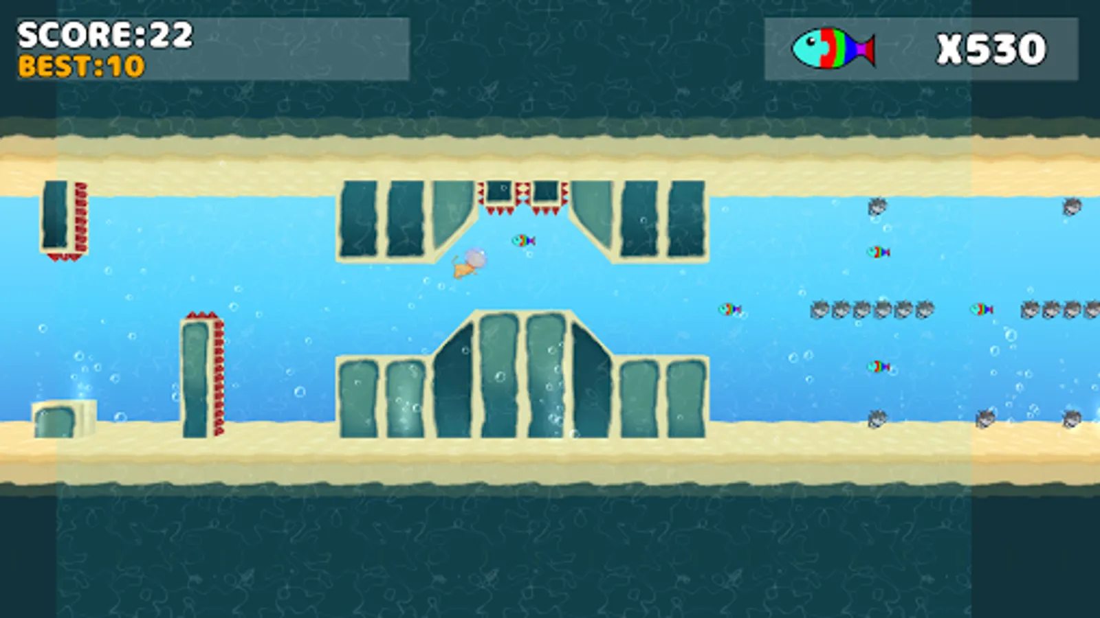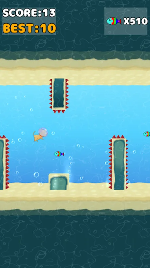 Swimming cat is a game, in which a player tabs on the screen to evade obstacles in order to swim the furthest distance.